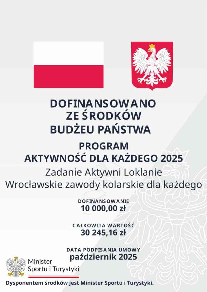 Miło nam poinformować, że otrzymaliśmy dofinansowanie z Programu Aktywni Lokalnie na realizację zadania „Wrocławskie zawody kolarskie dla każdego”. W ramach tego projektu w 2025 roku zorganizowaliśmy: – WroWelo Crit – Time Trial – WroWelo Track Dziękujemy za zaufanie i wsparcie. Zadanie publiczne dofinansowane ze środków Ministerstwa Sportu i Turystyki w ramach Programu Aktywność dla Każdego 2025 zadanie Aktywni Lokalnie, realizowanego przez Fundację Orły Sportu. #MSiT, #FundacjaOrłySportu #AktywniLokalnie